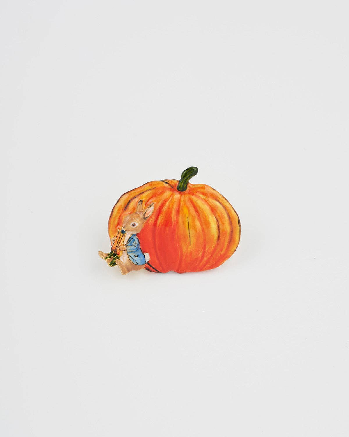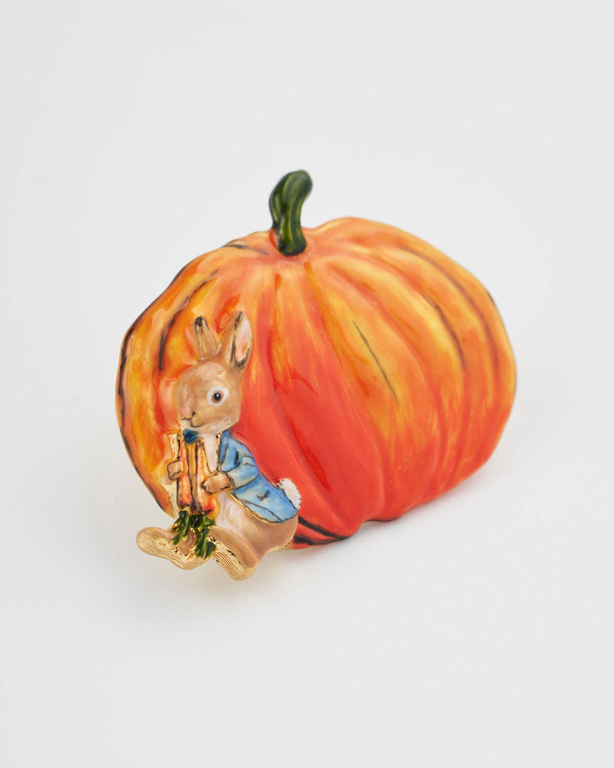 DESIGN DETAILS: Features the much-loved character Peter Rabbit playfully leaning against a harvest pumpkin. Expertly handcrafted and hand-painted in enamel, this piece boasts intricate detailing and a high-quality finish, making it an appealing gift item or accessory for the autumn season.