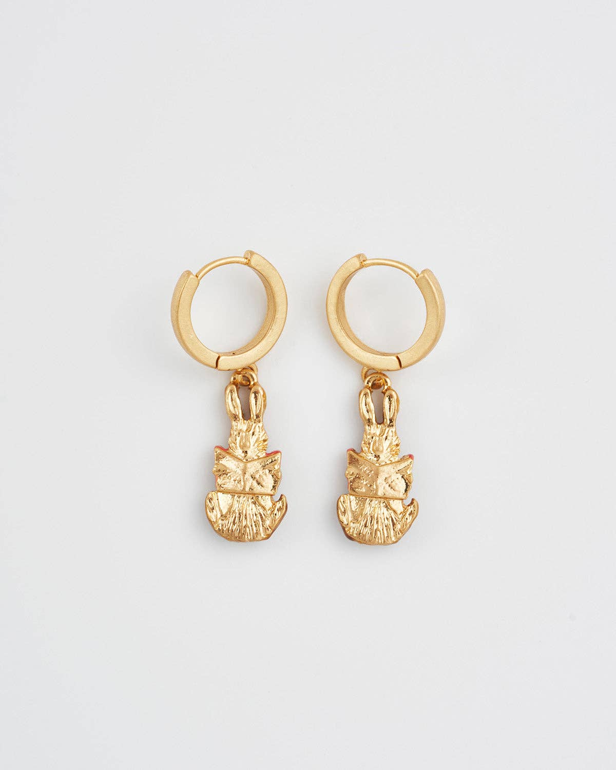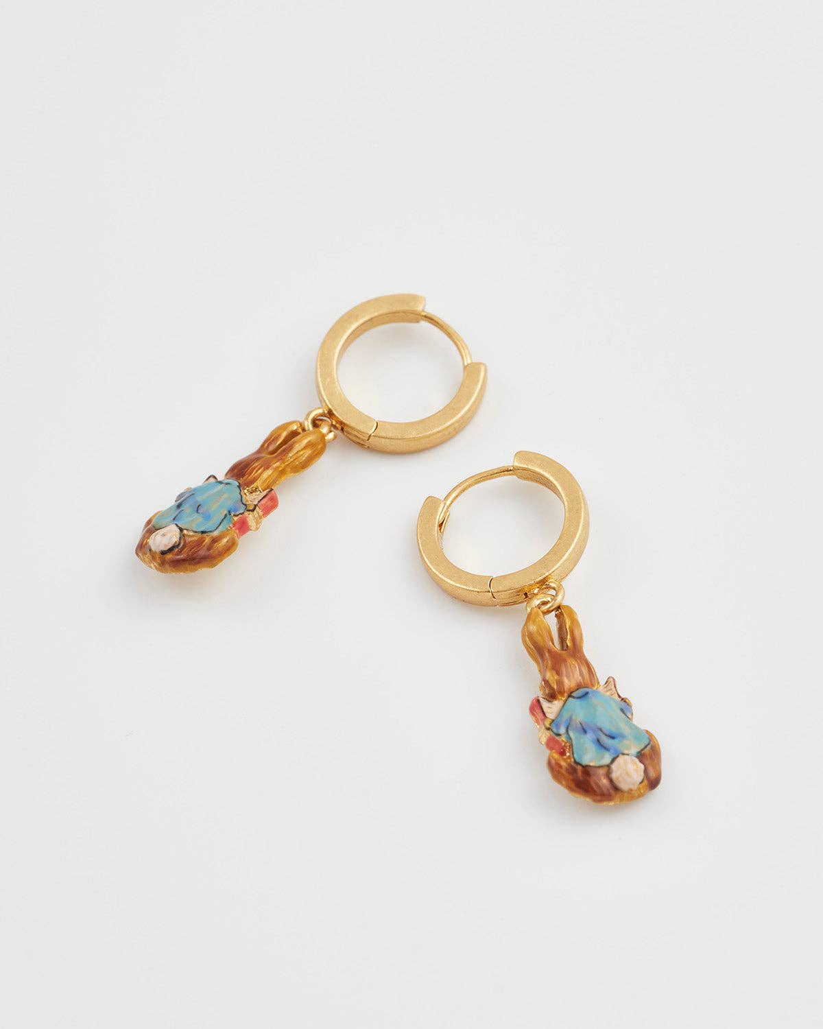 DESIGN DETAILS: These gold-plated huggies feature delicate enamel charms of Peter Rabbit enjoying a quiet moment with his book. Each charm is meticulously hand-painted and finished with his signature fluffy tail, combining playful character with timeless craftsmanship. Lightweight and wearable, they bring a subtle nod to nostalgia with a refined twist.
